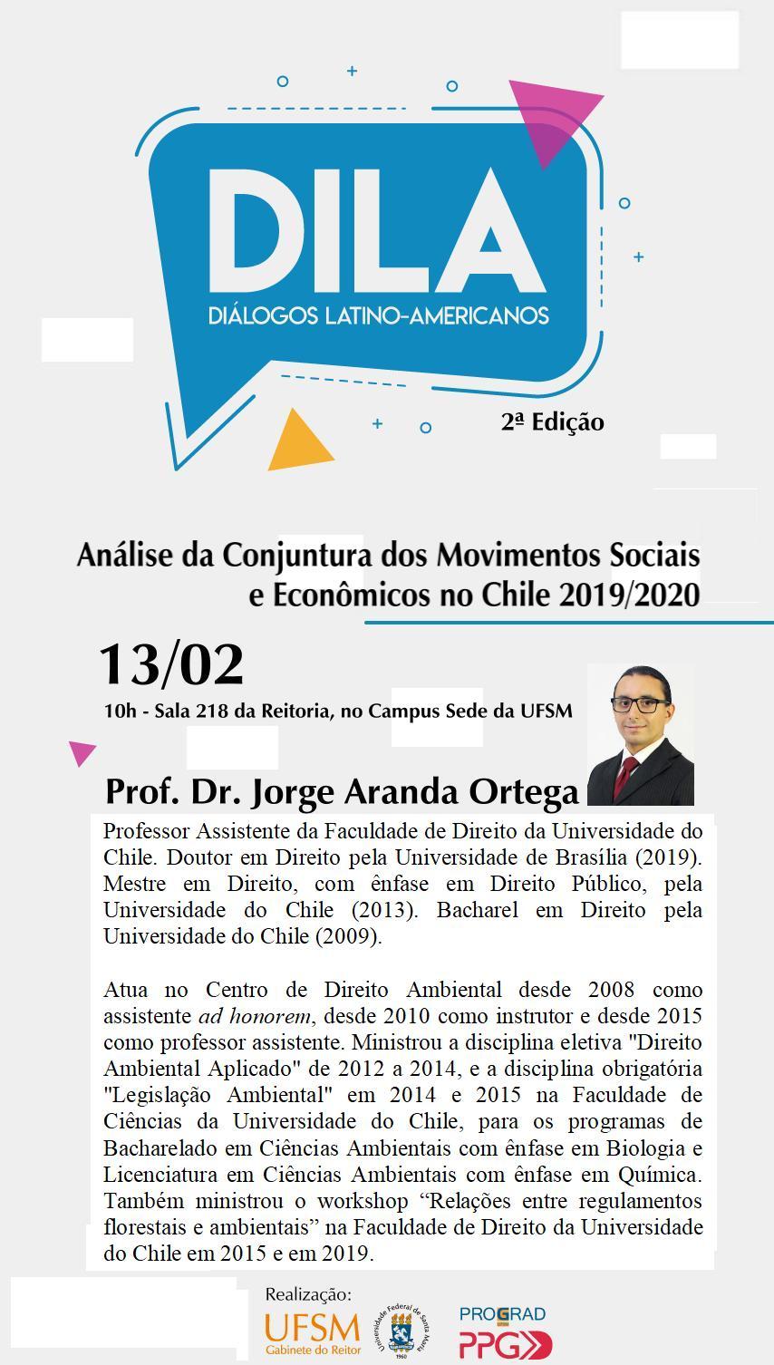 A segunda edição do evento Diálogos Latino-Americanos (Dila), que tem como tema os movimentos sociais e econômicos oriundos do Chile, terá como convidado Jorge Aranda Ortega, doutor em Direito pela Universidade de Brasília.