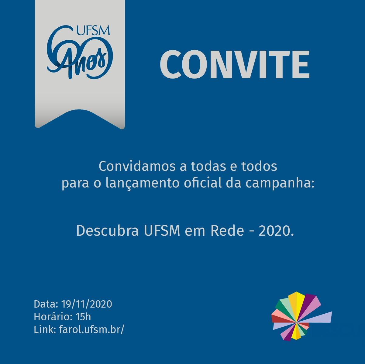 A Universidade Federal de Santa Maria convida a comunidade interna e externa à UFSM para o lançamento da campanha publicitária do Descubra UFSM em REDE. O evento acontecerá na quinta-feira, 19/11, às 15 horas, com transmissão pela plataforma ufsm.br/farol.