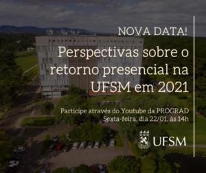 Marcada para acontecer na manhã de hoje (20), a reunião “Perspectivas sobre o retorno presencial naUFSM em 2021”  foi transferida para a próxima sexta-feira, dia 22, às 14 horas. A transmissão será feita através do Canal no YouTube da PROGRAD