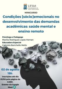 A Universidade Federal de Santa Maria está com inscrições abertas para o minicurso “Condições [sócio]emocionais no desenvolvimento das demandas acadêmicas: saúde mental e ensino remoto”. O encontro, via Google Meet, acontecerá no dia 02 de agosto, às 19 horas.