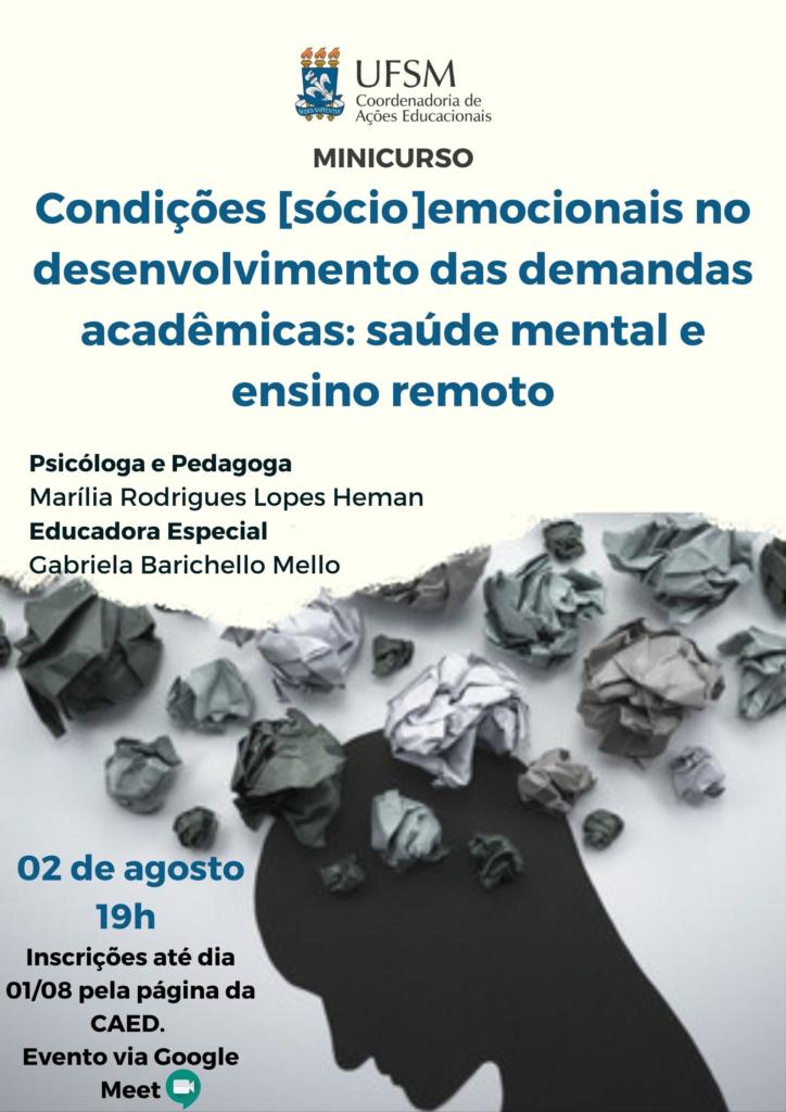 Descrição da imagem: cartaz de divulgação de minicurso. Imagem em formato vertical com o fundo na cor branca na parte superior. Centralizado encontra-se o brasão da universidade, junto da inscrição “UFSM”, “Coordenadoria de Ações Educacionais” e, abaixo, “Minicurso” escrito na cor preta. Em seguida, na cor azul, está escrito o título “Condições [sócio] emocionais no desenvolvimento das demandas acadêmicas: saúde mental e ensino remoto”. Abaixo, no canto esquerdo, na cor preta está escrito “Psicóloga e Pedagoga Marília Rodrigues Lopes Heman”, seguido de “Educadora Especial Gabriela Barichello Mello”. Na parte inferior do cartaz tem uma imagem de um contorno preto de uma pessoa inclinando a cabeça para baixo e, acima da sua cabeça, há diversos papéis amassados de diferentes tamanhos, em tons de cinza, branco e preto distribuídos pela imagem. No canto inferior esquerdo está escrito, na cor azul, “02 de agosto 19h”. Abaixo, na cor preta, “Inscrições até dia 01/08 pela página da CAED. Evento via Google Meet”. Ao lado direito, um ícone de balão verde com uma câmera branca dentro.