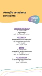 31/8 a 3/9 – Encontros com os cursos para apresentação do questionário do estudante e momento tira-dúvidas sobre o Enade. Horários e salas do Google Meet serão enviados aos/às estudantes pelos Coordenadores por e-mail.