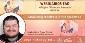 A Coordenadoria de Tecnologia Educacional (CTE) da Pró-reitoria de Graduação (Prograd) divulga mais uma palestra dos Webinários EaD: Múltiplos Olhares em Formação. O encontro virtual será com o professor Cristiano Egger Veçossi e terá mediação de Maria Aparecida Nunes Azzolin. O palestrante apresentará considerações sobre a escrita acadêmica.