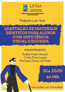 Cartaz de divulgação de palestra online em formato retangular, disposto verticalmente, com fundo amarelo e uma pequena borda na cor branca. Na parte superior, o brasão da Universidade Federal de Santa Maria com “UFSM” à direita, abaixo “Coordenadoria de Ações Educacionais” e “Subdivisão de Acessibilidade: CAED/PROGRAD”. A seguir “Palestra on-line”. Logo abaixo, em laranja, o título: “Adaptação de materiais didáticos para alunos com Deficiência Visual/Cegueira”, dentro de um retângulo azul escuro com bordas orgânicas que imitam um papel rasgado. Abaixo, na cor azul, o nome das palestrantes: “Suélly Krein Heuert, Cíntia Pasa Lopes e Monique Zanon da Rosa”. A seguir, à direita, outro retângulo, com as mesmas características que o anterior, porém, em tamanho menor, contendo, na cor laranja, as informações: “Dia 20/01 às 14 horas”. Por fim, abaixo do retângulo, na cor azul escura: “inscrições via formulário”.