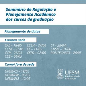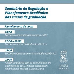 A Universidade Federal de Santa Maria, por meio da Pró-reitoria de Graduação (Prograd), definiu o cronograma do Seminário de Regulação e Planejamento Acadêmico dos Cursos de Graduação, a ser desenvolvido no primeiro semestre de 2022.