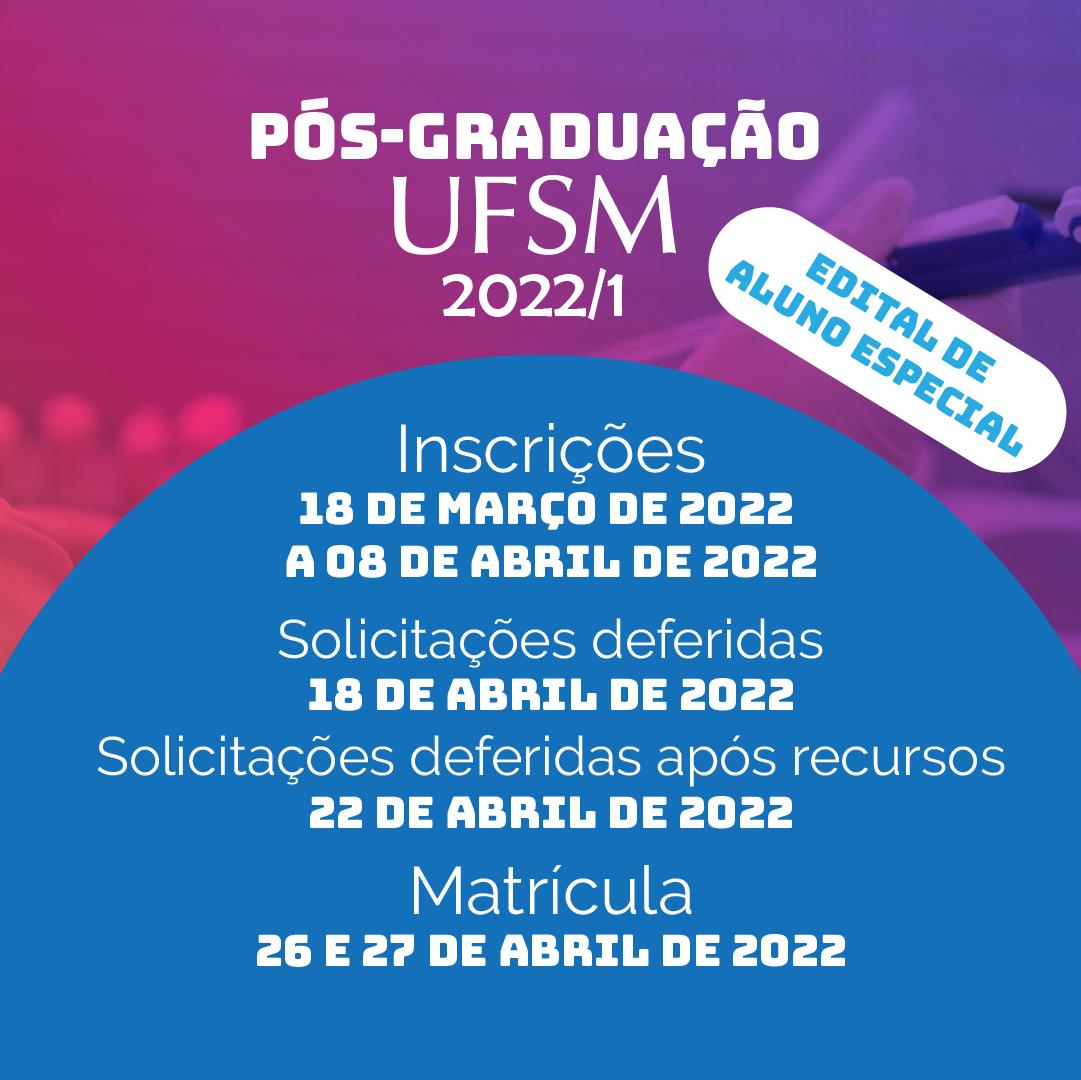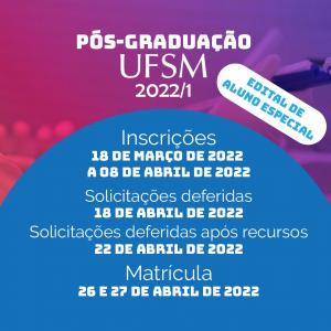 A Universidade Federal de Santa Maria, por meio da Pró-Reitoria de Pós-Graduação e Pesquisa (PRPGP), publicou o Edital 008/2022/PRPGP/UFSM, para interessados(as) em solicitar matrícula na categoria de Aluno Especial I em disciplinas dos cursos de Pós-Graduação no 1º semestre letivo da instituição.
