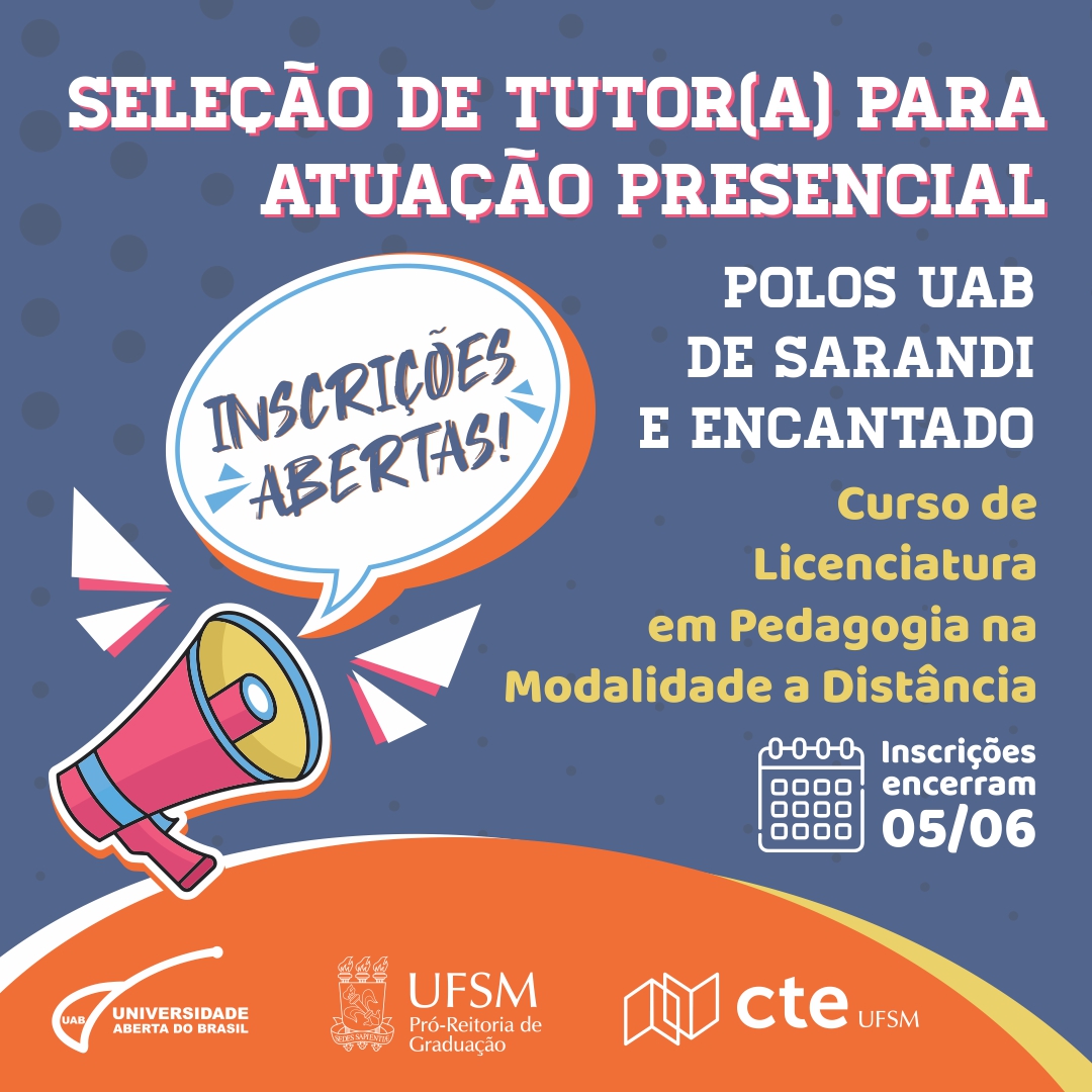 A Universidade Federal de Santa Maria, em parceria com a Universidade Aberta do Brasil, está com inscrições abertas, até o dia 05 de junho, para seleção de tutor(a) para atuação presencial nos Polos UAB de Sarandi e Encantado, no Curso de Licenciatura em Pedagogia na modalidade a distância.