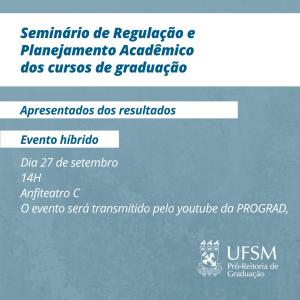A Universidade Federal de Santa Maria, por meio da Pró-reitoria de Graduação (Prograd), convida sua comunidade para uma reunião aberta, visando à apresentação dos resultados obtidos durante o Seminário de Regulação e Planejamento Acadêmico.