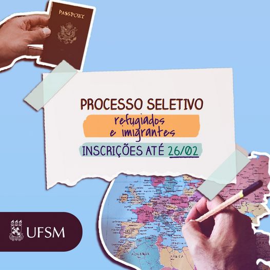 A Universidade Federal de Santa Maria, por meio da Pró-Reitoria de Graduação (Prograd), tornou público o edital do Processo Seletivo para Ingresso de refugiados e imigrantes em situação de vulnerabilidade nos cursos de graduação presenciais da Instituição. Os selecionados serão matriculados no primeiro ou no segundo semestre deste ano, conforme oferta de vagas. As inscrições vão até o dia 26 de fevereiro de 2023 e devem ser realizadas pelo acesso ao sistema de envio de documentação, em formato PDF, conforme solicitado no Edital.