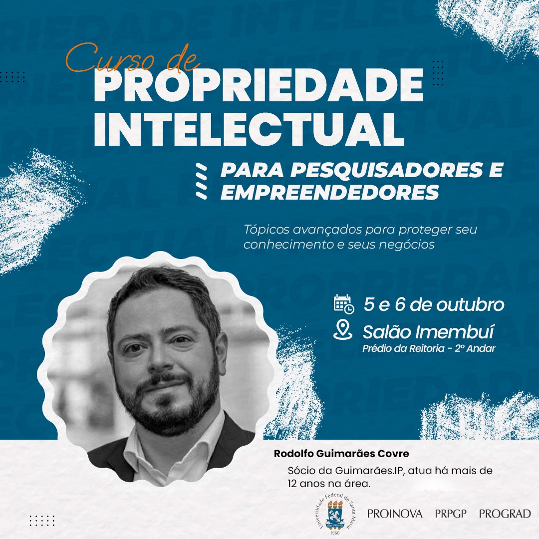 A Pró-Reitoria de Inovação e Empreendedorismo (Proinova), Pró-Reitoria de Pós-Graduação e Pesquisa (PRPGP) e Pró-Reitoria de Graduação (Prograd) da UFSM vão promover, entre os dias 5 e 20 de outubro, curso de propriedade intelectual para pesquisadores, empreendedores e demais interessados no tema. Rodolfo Guimarães Covre, que atua há mais de 12 anos na área, vai abordar tópicos avançados para proteger o conhecimento e os negócios dos participantes.