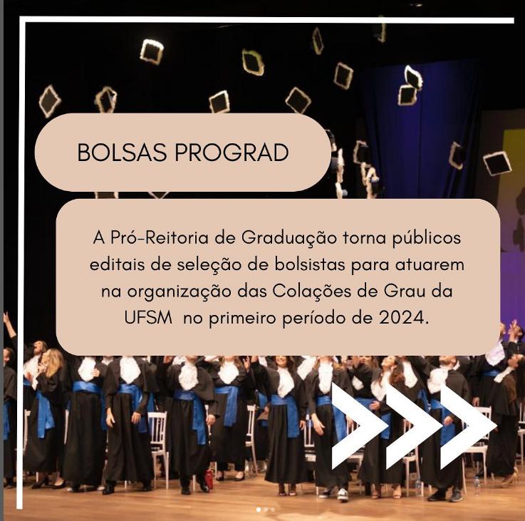 A Universidade Federal de Santa Maria, por meio da Pró-reitoria de Graduação, divulga dois editais de seleção para acadêmicos(as) de graduação da UFSM interessados(as) em colaborar como bolsistas nas colações de grau institucionais.