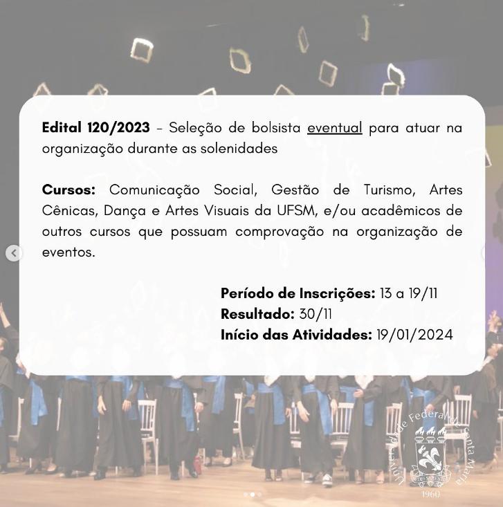 Carga horária: 6h por evento. Vagas para acadêmicos(as) dos Cursos de Comunicação Social, Gestão de Turismo, Artes Cênicas, Dança e Artes Visuais da UFSM, e/ou acadêmicos de OUTROS CURSOS que possuam comprovação na organização de eventos (semanas acadêmicas, congressos, seminários e outros eventos científicos ou culturais). Por se tratar de bolsa EVENTUAL, o(a) candidato(a) PODE dispor de outra bolsa Institucional.