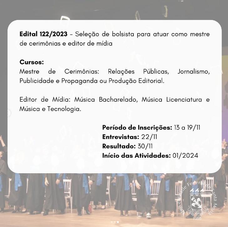 - Edital 122/2023 – Mestre(a) de Cerimônias e Editor(a) de Mídia: