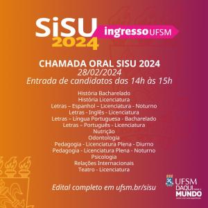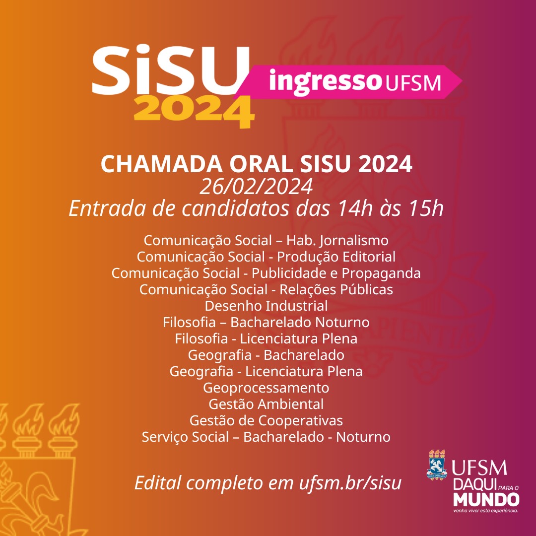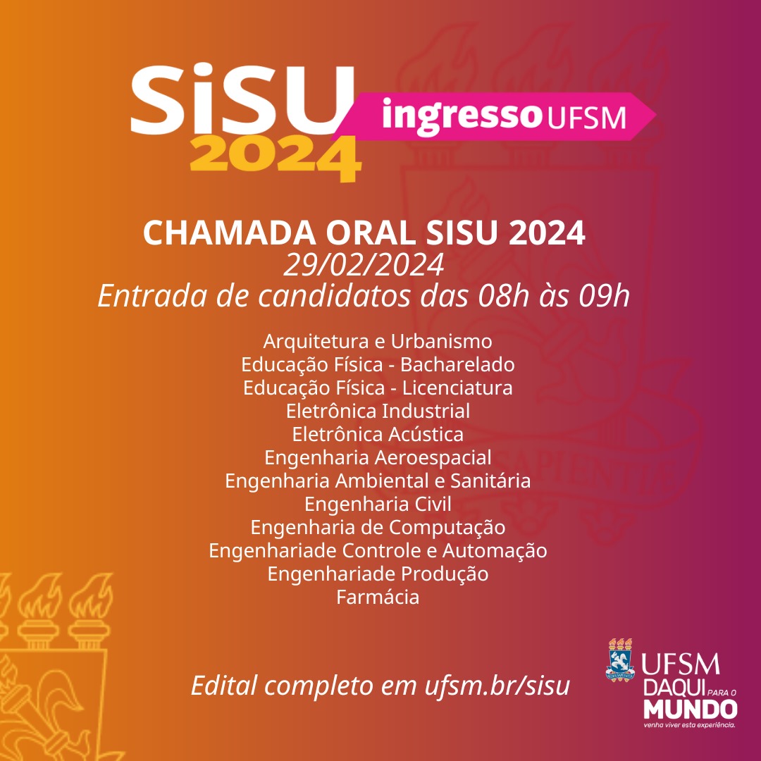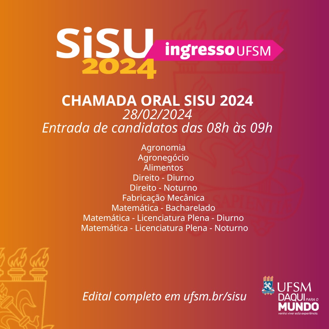 De 26 a 29 de fevereiro, as Chamadas Orais acontecerão no Centro de Convenções e serão destinadas aos cursos da UFSM localizados no Campus Sede, em Santa Maria. Cada curso tem um dia e horário específicos para comparecimento dos(as) candidatos(as) e procuradores(as).