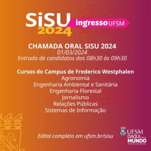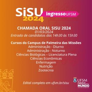 No dia 1º de março pela manhã, as Chamadas Orais ocorrerão no Campus da UFSM de Frederico Westphalen, para os cursos sediados no município. À tarde, as Chamadas acontecerão no Campus UFSM de Palmeira das Missões, também para os cursos lá sediados.
