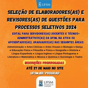 As inscrições foram prorrogadas para 27 de maio. O Edital 038/2024 está disponível no site ufsm.br/prograd. Outras informações podem ser solicitadas ao Núcleo de Ingresso e Seleção Acadêmicos, pelo e-mail falecom@nisa.ufsm.br.