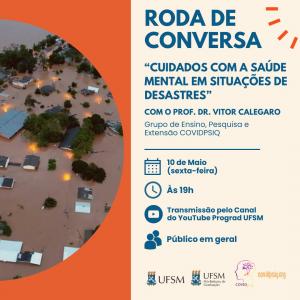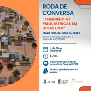 Já a segunda roda de conversa é direcionada a profissionais de saúde e acontecerá no sábado, dia 11 de maio, às 10 horas, também pelo canal do Youtube “Prograd UFSM”. O tema será “Emergências psiquiátricas em desastres”.
