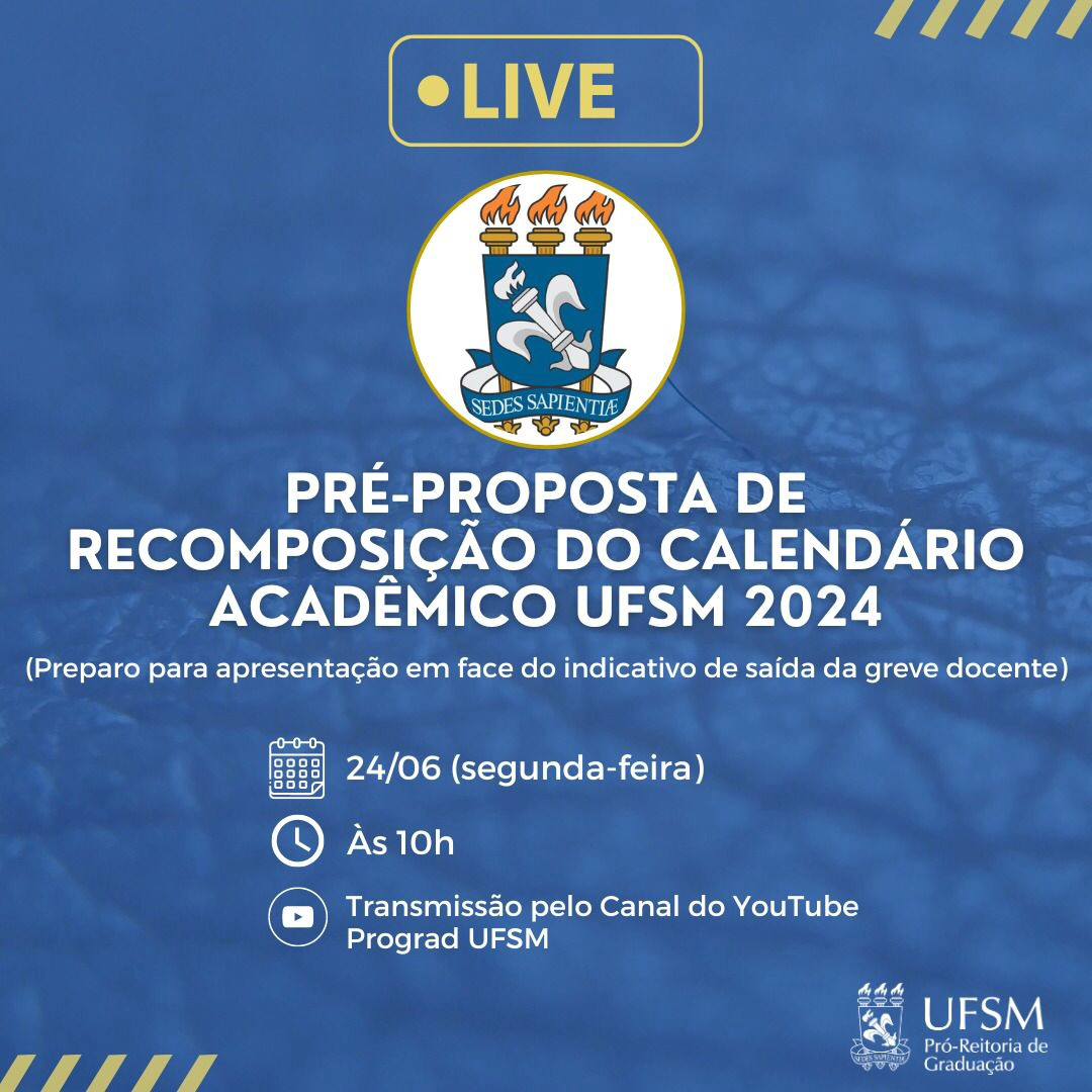 Na segunda-feira (24), a partir das 10h, a PROGRAD realiza, junto ao Gabinete do Reitor, uma LIVE que irá apresentar e debater a pré-proposta de recomposição do Calendário Acadêmico UFSM 2024. A transmissão será realizada pelo Canal do YouTube Prograd UFSM, no link