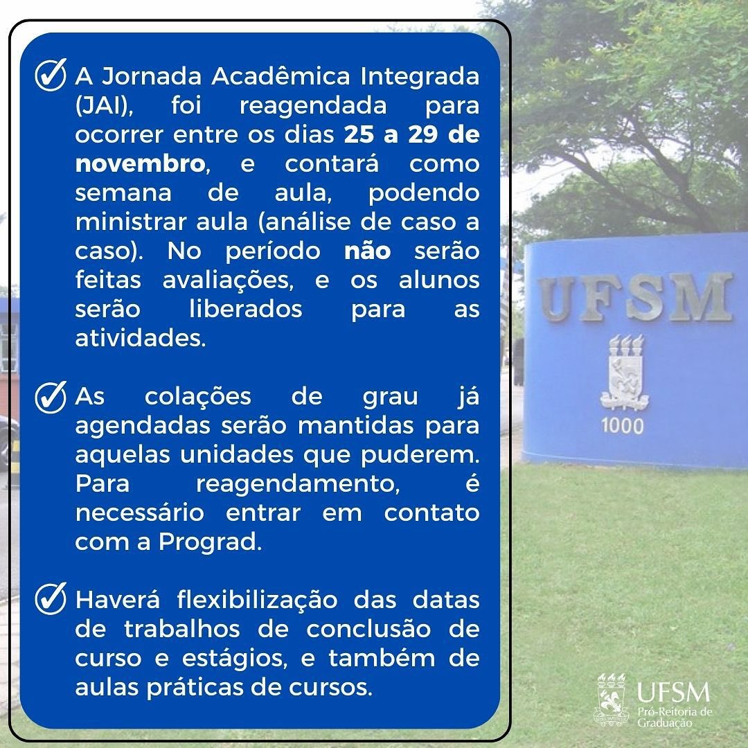 A semana da Jornada Acadêmica Integrada (entre 25 e 29 de novembro) será considerada letiva, podendo ou não ter aulas, a depender da situação, desde que sem avaliações e acordado com a Coordenação do Curso e a Pró-reitoria de Graduação (Prograd).