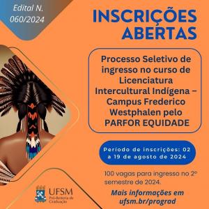 A Universidade Federal de Santa Maria, por meio da Pró-reitoria de Graduação (Prograd) e do Programa PARFOR Equidade, está com inscrições abertas para ingresso no curso de Licenciatura Intercultural Indígena – Campus Frederico Westphalen.
