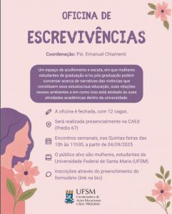 Já nas quintas-feiras, das 10h às 11h30 na CAEd (Prédio 67), a Oficina de “Escrevivências” busca congregar mulheres estudantes de graduação e/ou pós-graduação da UFSM para um diálogo a respeito de suas vivências e relações nos ambientes educacionais, em um momento de acolhimento e escuta.