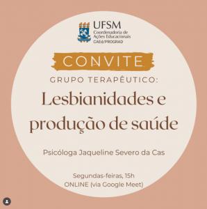 Às segundas-feiras, às 15 horas, via Google Meet, é ofertado o Grupo Terapêutico on-line “Lesbianidades e produção de saúde“. A proposta é oferecer um espaço coletivo de compartilhamento, escuta e acolhimento das diversas experiências relacionadas à sexualidade, as quais perpassam a vida das mulheres lésbicas, com o intuito de, entre pares, serem produzidas ferramentas para fortalecimento individual e coletivo.