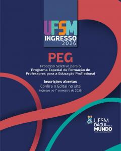 As inscrições ao PEG vão até o dia 19 de janeiro de 2026 e devem ser feitas no Painel do(a) Candidato(a) disponibilizado junto ao Edital 098/2025, no site ufsm.br/prograd. A taxa de inscrição é de R$ 75,00 e pode ser paga até o dia 20 de janeiro.