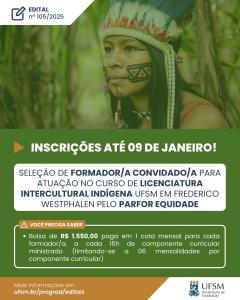 A Universidade Federal de Santa Maria, através da Pró-Reitoria de Graduação (Prograd), divulgou a seleção de Formador(a) Convidado(a) para atuação no Curso de Licenciatura Intercultural Indígena – Campus da UFSM em Frederico Westphalen, ofertado a partir do Programa Nacional de Fomento à Equidade na Formação de Professores da Educação Básica – PARFOR EQUIDADE, por intermédio do Edital Conjunto Nº 23/2023 – CAPES/SECADI.