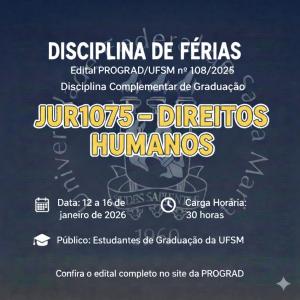 A Universidade Federal de Santa Maria, por meio da Pró-Reitoria de Graduação (Prograd) e do Departamento de Direito, abriu inscrições para a Disciplina Complementar de Graduação “Direitos Humanos” (código JUR1075), a ser ofertada durante o recesso acadêmico.