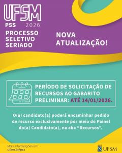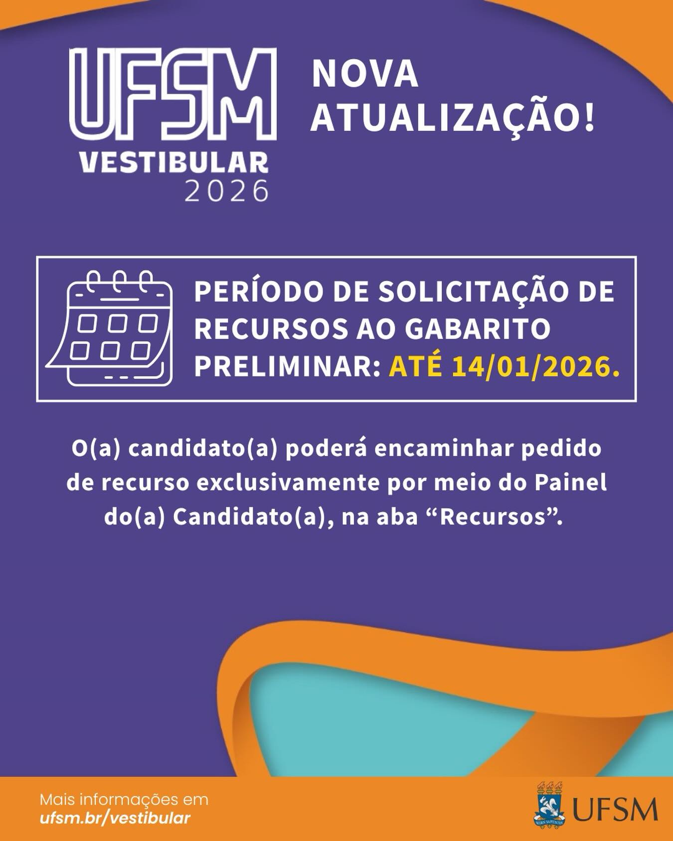 As pessoas interessadas poderão fazer o encaminhamento pelo Painel do(a) Candidato(a), na aba “Recursos”, até o dia 14/1, conforme as instruções previstas no item 13 (página 56) do Manual do Vestibular UFSM 2026, disponível no site ufsm.br/vestibular, ou do Processo Seriado, publicado em ufsm.br/pss.