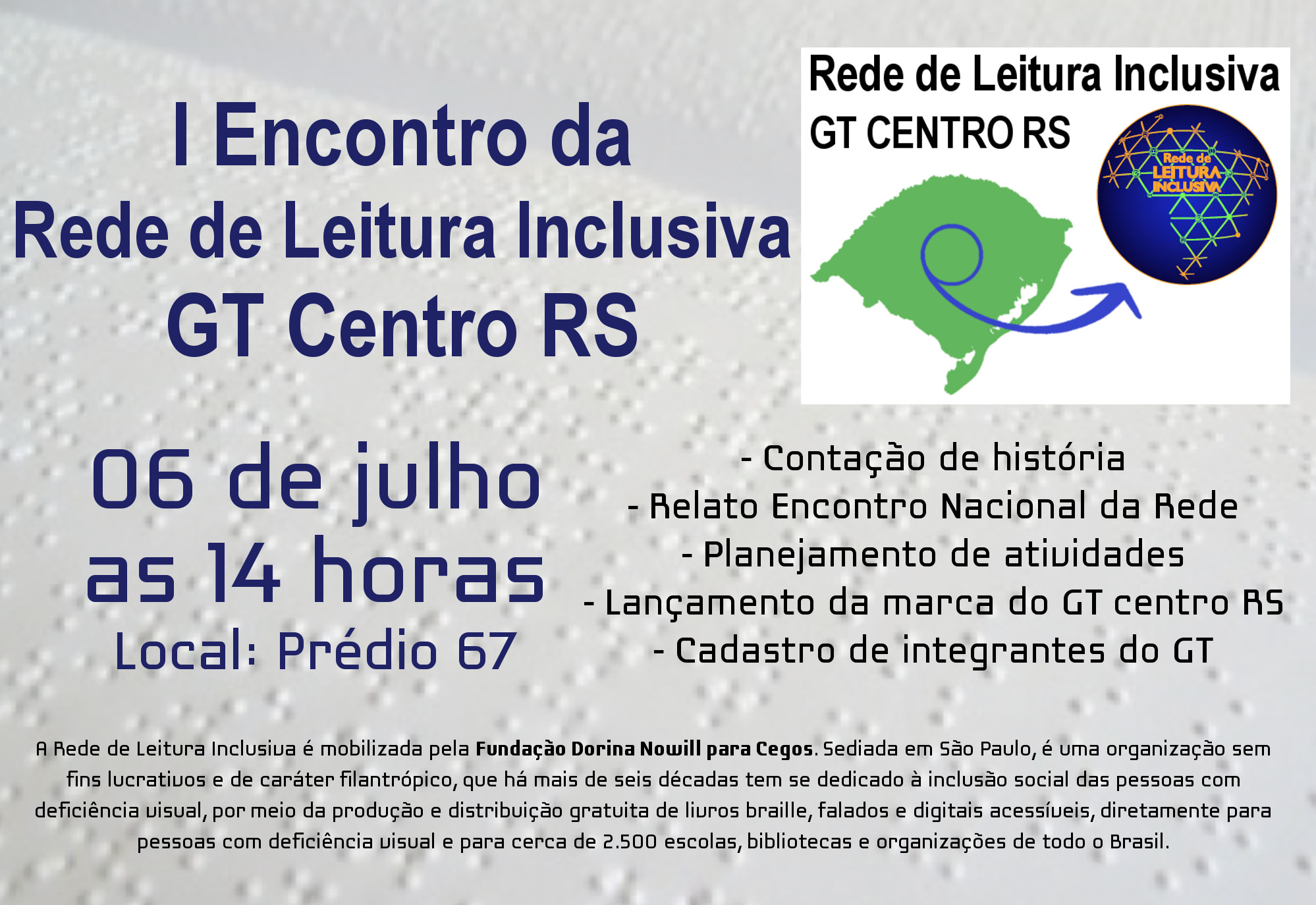 Assim, às 14 horas de 06 de julho acontecerá o I Encontro da Rede de Leitura Inclusiva do GT Centro RS no prédio 67 do Campus da UFSM.