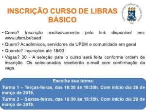 A Universidade Federal de Santa Maria (UFSM)/Coordenadoria de Ações Educacionais (CAEd) divulga que se encontram abertas as inscrições do curso de Libras para acadêmico(a)s, servidore(a)s da UFSM e comunidade em geral.
