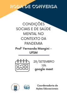 A Universidade Federal de Santa Maria/Coordenadoria de Ações Educacionais(CAEd) convida a todo(a)s para a roda de conversa intitulada Condições Sociais e de Saúde Mental no Contexto da Pandemia, com a Profª Fernanda Mangini, coordenadora do curso de Serviço Social da UFSM, dia 28 de setembro de 2020, às 19h00min, via Google Meet.
