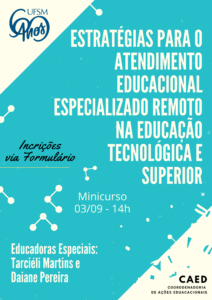A Universidade Federal de Santa Maria(UFSM)/Coordenadoria de Ações Educacionais(CAEd) convida a todos para o minicurso intitulado “Estratégias para o atendimento educacional especializado remoto na educação tecnológica e superior”, a se realizar no dia 03 de setembro de 2019, às 14h00min.