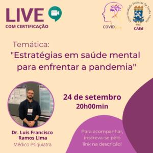 Nessa premissa, o projeto COVIDPsiq promoverá, no dia 24 de setembro de 2020, a reprise da live “Estratégias em saúde mental para enfrentar a pandemia”, ministrada pelo Dr. Luis Francisco Ramos Lima.