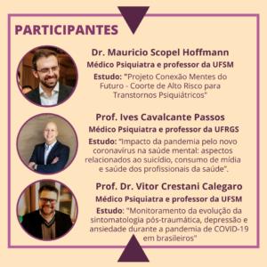 DESCRIÇÃO DA IMAGEM 02: imagem em formato quadrado, com fundo na cor bege, delimitado por bordas na cor roxa. Nas bordas superior e inferior, há uma seta, em forma de triângulo, apontando para o centro da ilustração. No canto superior esquerdo, lê-se “PARTICIPANTES”, em letras na cor roxa. Abaixo, à esquerda, dentro de círculos na cor roxa, em sentido vertical, há as fotos dos três ministrantes do evento. O primeiro ministrante apresentado é o Dr. Maurício Scopel Hoffmann, médico psiquiatra e professor da UFSM, tratando-se de homem de pele clara, cabelos e barba na cor castanha e expressão sorridente. Veste camisa social branca e paletó na cor grafite. É o pesquisador responsável pelo estudo “Projeto Conexão Mentes do Futuro – Coorte de Alto Risco para Transtornos Psiquiátricos”. O segundo ministrante é o Prof. Ives Cavalcante Passos, médico psiquiatra e professor da UFRGS, tratando-se de homem de pele clara, expressão sorridente, com braços cruzados,e vestindo camisa social branca e paletó azul escuro. É o pesquisador responsável pelo estudo “Impacto da pandemia pelo novo coronavírus na saúde mental: aspectos relacionados ao suicídio, consumo de mídia e saúde dos profissionais de saúde”. O terceiro ministrante é o Prof. Dr. Vitor Crestani Calegaro, médico psiquiatra e professor da UFSM, tratando-se de homem de pele clara, cabelos curtos e castanhos e expressão sorridente. Usa óculos de grau e barba. Veste camisa social bege, blusa pull over, nas cores marrom e preta, e casaco preto. É o pesquisador responsável pelo estudo “Monitoramento da evolução da sintomatologia pós-traumática, depressão e ansiedade durante a pandemia de COVID-19 em brasileiros”. A identificação dos ministrantes e a indicação de seus respectivos estudos encontram-se à esquerda das fotos, em disposição vertical, na ordem que a apresentação dos mesmos foi descrita.