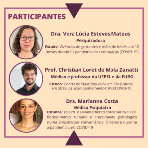 DESCRIÇÃO DE IMAGEM 03: imagem em formato quadrado, com fundo na cor bege, delimitado por bordas na cor roxa. Nas bordas superior e inferior, há uma seta, em forma de triângulo, apontando para o centro da ilustração. No canto superior esquerdo, lê-se “PARTICIPANTES”, em letras na cor roxa. Abaixo, à esquerda, dentro de círculos na cor roxa, em sentido vertical, há as fotos dos três ministrantes do evento. A primeira ministrante apresentada é a professora Vera Lúcia Esteves Mateus, pesquisadora, tratando-se de mulher de pele clara, cabelos castanhos até a altura dos ombros, usando óculos e vestindo blusa preta. É a pesquisadora responsável pelo estudo “Vivências de gestantes e mães de bebês até 12 meses durante a pandemia do coronavírus (COVID-19). O segundo ministrante é o Prof. Christian Loret de Mola Zanatti, médico e professor da UFPEL e da FURG, tratando-se de homem de pele clara, cabelos e barba castanhos, com cabelos encaracolados, expressão sorridente, vestindo camisa social na cor preta. É o pesquisador responsável pelo estudo “Coorte de Nascidos Vivos em Rio Grande em 2019: os acompanhamentos WEBCOVID-19”. A terceira ministrante é a Dra. Marianna Costa, médica psiquiatra, tratando-se de mulher de pele clara, cabelos lisos e castanhos, expressão sorridente, usando joias e vestindo blusa bege. É a pesquisadora responsável pelo estudo “TelePsi e Levantamento sobre variáveis de florescimento humano e crescimento psicológico numa amostra por conveniência brasileira durante a pandemia pelo COVID-19”. A identificação dos ministrantes e a indicação de seus respectivos estudos encontram-se à esquerda das fotos, em disposição vertical, na ordem que a apresentação dos mesmos foi descrita.