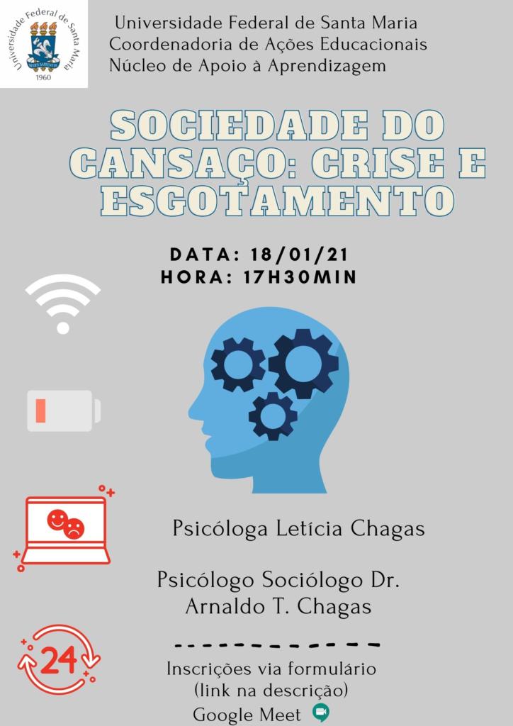 Imagem retangular, na vertical, com o fundo na cor cinza claro. No canto superior direito, há o brasão da UFSM. Ao lado dele, escrito em letras na cor preta, lê-se: “Universidade Federal de Santa Maria Coordenadoria de Ações Educacionais Núcleo de Apoio à Aprendizagem” Abaixo e centralizado, escrito em letras grandes, na cor branca, contornado em azul, lê-se: ” Sociedade do cansaço: crise e esgotamento”. Mais abaixo, escrito em letras menores, na cor preta, lê-se: “Data: 18/01/21 Hora: 17h30min”. Na sequência, há o desenho colorido da cabeça de uma pessoa, de perfil e, abaixo desse desenho, escrito em letras na cor preta, lê-se: “Psicóloga Letícia Chagas Psicólogo Sociólogo Dr. Arnaldo T. Chagas. Na parte inferior, escrito em letras pretas, lê-se “Inscrições via formulário (link na descrição) Google Meet”. Em toda a lateral esquerda da imagem, há quatro desenhos coloridos, um abaixo do outro, sendo estes: um sinal de wifi, um símbolo de bateria baixa, um notebook e o número 24, dentro de um círculo, formado por duas setas.