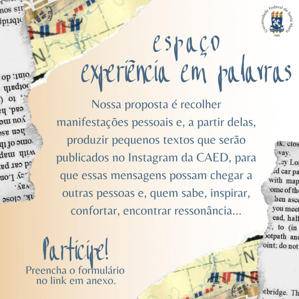 Descrição da imagem: imagem retangular na vertical, com fundo alaranjado degradê da esquerda para a direita, onde a cor vai ficando mais clara. No canto superior esquerdo, um recorte de letras de jornal e de revista, no canto superior direito o emblema da Universidade Federal de Santa Maria. No canto inferior direito tem o mesmo detalhe do canto superior esquerdo, colagens de jornal preto e branco e colorido. Ao centro da imagem, escrito em letras que aludem à escrita de carta na cor azul acinzentado o seguinte: “espaço experiência em palavras”. Abaixo, o seguinte texto, na mesma cor: “Nossa proposta é recolher manifestações pessoais e, a partir delas, produzir pequenos textos que serão publicados no instagram da CAED, para que essas mensagens possam chegar a outras pessoas e, quem sabe, inspirar, confortar, encontrar ressonância…” No lado inferior esquerdo, também em letras azuis, o texto “Participe! Preencha o formulário no link em anexo.”