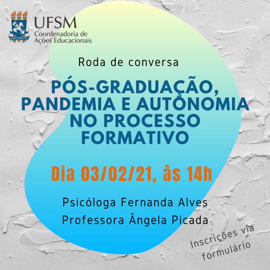 Descrição da imagem: imagem quadrada com fundo na cor branca, representando uma parede de gesso. No centro, há uma grande mancha circular, em degradê, das cores verde claro para a cor azul, onde consta, em letras pequenas e na cor preta, a seguinte escrita: “Roda de Conversa”. Abaixo, em letras maiúsculas e na cor azul, consta o título do evento: “Pós-Graduação, Pandemia e autonomia no processo formativo”. Mais abaixo, em letras laranjas, lê-se “Dia 03/02/21, às 14h”. Por fim, na parte inferior, escrito em letras pequenas e na cor preta, lê-se “Psicóloga Fernanda Alves, Professora Ângela Picada”. No canto superior esquerdo, encontra-se o brasão da UFSM e, logo abaixo, lê-se Coordenadoria de Ações Educacionais. No canto inferior direito, em letras pequenas e na cor preta, lê-se “Inscrições Via Formulário”.
