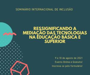Descrição da imagem: card de divulgação de evento, em formato quadrado e com fundo azul petróleo. Na parte superior, centralizado, em amarelo, lê-se: “SEMINÁRIO INTERNACIONAL DE INCLUSÃO”. Abaixo e à esquerda, há a metade direita de uma esfera azul clara, parcialmente dividida por uma linha horizontal ondulada rosa. Na parte inferior à linha rosa, há pontos de tom claro que se sobrepõem parcialmente à área azul clara, formando a parte superior da metade direita de outra esfera, com o dobro do tamanho da primeira. Na margem inferior, há linhas rosas que formam as bordas superiores e laterais de um cubo, que se sobrepõe à parte inferior da esfera pontilhada. À direita das esferas, em amarelo, lê-se: “RESSIGNIFICANDO A MEDIAÇÃO DAS TECNOLOGIAS NA EDUCAÇÃO BÁSICA E SUPERIOR”. Abaixo e alinhado à direita, consta: “9 e 10 de agosto de 2021, Evento Online e Gratuito!, Inscreva-se pelo formulário!”.