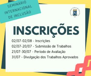Descrição da imagem: card de divulgação de evento, em formato quadrado e com fundo amarelo. Na parte superior esquerda, há um retângulo azul claro, em diagonal ascendente. Dentro dele, em azul escuro, há o texto: “SEMINÁRIO INTERNACIONAL DE INCLUSÃO”. Centralizado no card, há um quadrado branco sobreposto a um quadrado azul petróleo inclinado. No quadrado branco, na parte superior direita, há o brasão da Universidade Federal de Santa Maria. Abaixo, seguem textos na cor azul-petróleo. Ao centro, lê-se “INSCRIÇÕES”. Abaixo, alinhado à esquerda, consta: “02/07 – 02/08 – Inscrições, 02/07 – 20/07 – Submissão de Trabalhos, 21/07 – 30/07 – Período de Avaliação, 31/07 – Divulgação dos Trabalhos Aprovados.” Na parte inferior direita, há duas linhas onduladas e paralelas, na cor rosa, em diagonal ascendente, que se sobrepõem às partes do quadrado branco, do quadrado azul e do fundo amarelo.