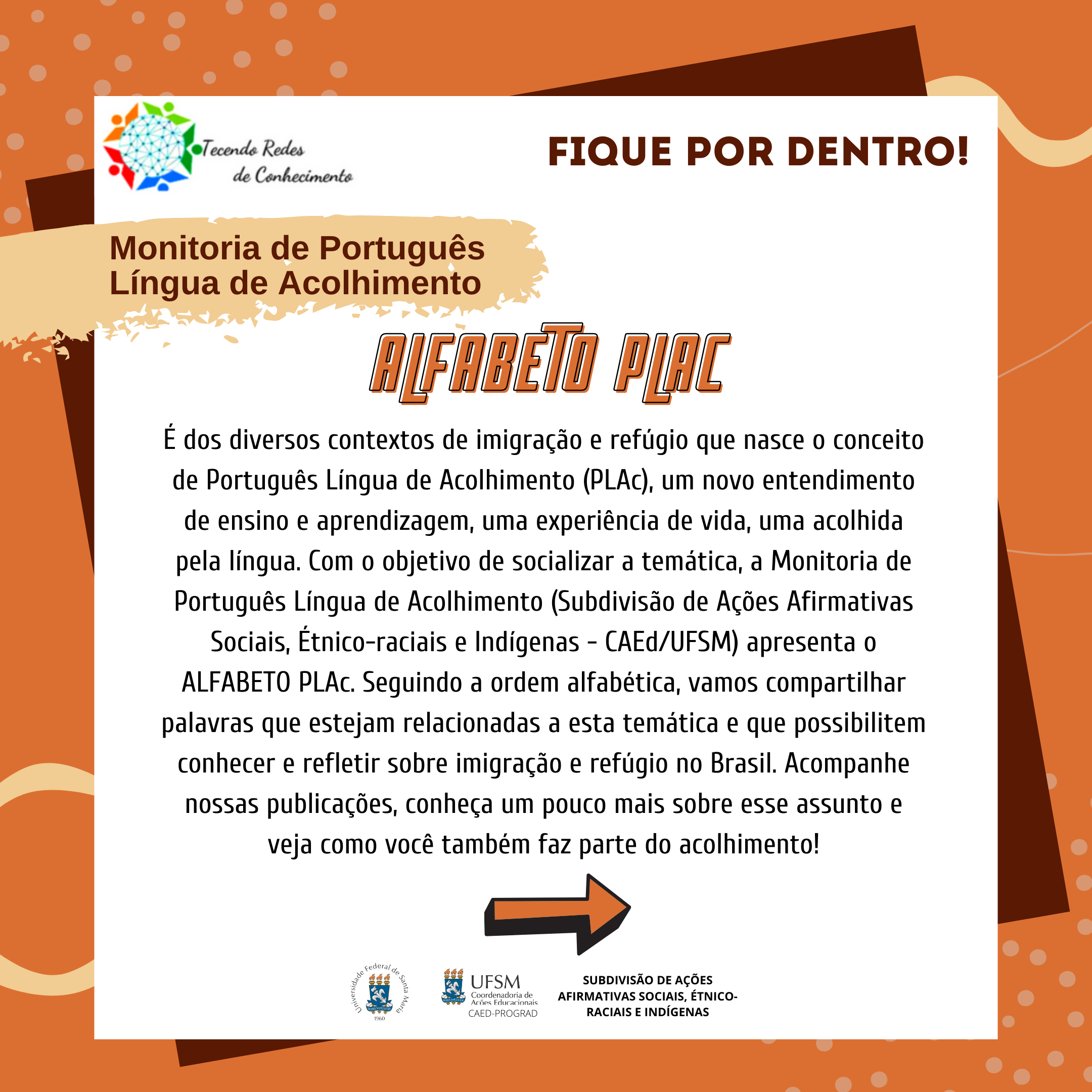 Descrição de Imagens: acima e na esquerda a logo do projeto ‘Tecendo Redes de Conhecimento’, na direita em caps lock ‘Fique por dentro! ’. Logo após, também na esquerda ‘Monitoria de Português Língua de Acolhimento’. Abaixo. Centralizado, o título “Alfabeto PLAc”. Em seguida, “É dos diversos contextos de imigração e refúgio que nasce o conceito de Português Língua de Acolhimento (PLAc), um novo entendimento de ensino e aprendizagem, uma experiência de vida, uma acolhida pela língua. Com o objetivo de socializar a temática, a Monitoria de Português Língua de Acolhimento (Subdivisão de Ações Afirmativas Sociais, Étnico-raciais e Indígenas – CAEd/UFSM) apresenta o ALFABETO PLAc. Seguindo a ordem alfabética, vamos compartilhar palavras que estejam relacionadas a esta temática e que possibilitem conhecer e refletir sobre imigração e refúgio no Brasil. Acompanhe nossas publicações, conheça um pouco mais sobre esse assunto e veja como você também faz parte do acolhimento! ”. Após o texto, uma seta em laranja apontando para a direita. Na parte inferior centralizadas, as logos da UFSM, CAED-PROGRAD e a escrita “SUBDIVISÃO DE AÇÕES AFIRMATIVAS SOCIAIS, ÉTNICO-RACIAIS E INDÍGENAS”. O fundo da imagem é branco com uma borda laranja com arabescos em tons de marrom bem claro.