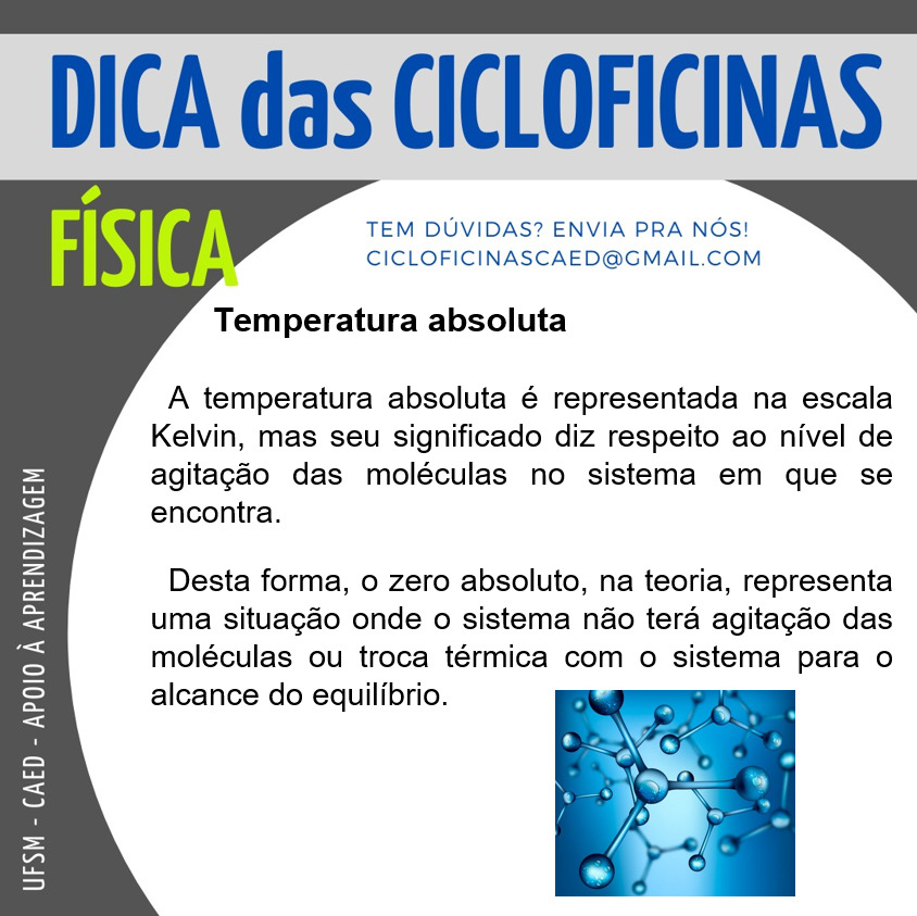 Descrição da imagem: Imagem retangular na horizontal, o fundo é na cor cinza escuro. Na parte superior há um retângulo na cor cinza claro onde tem escrito em letras na cor azul o título “Dicas das Cicloficinas”. Abaixo e no lado esquerdo, em letras na cor verde “Física” e do lado em letras pequenas e na cor azul “Tem dúvidas? Envia pra nós! cicloficinascaed@gmail.com”. No centro da imagem há um círculo na cor branca e dentro dele, em letras na cor preta há a seguinte dica: “Temperatura absoluta – A temperatura absoluta é representada na escala Kelvin, mas seu significado diz respeito ao nível de agitação das moléculas no sistema em que se encontra. Desta forma, o zero absoluto, na teoria, representa uma situação onde o sistema não terá agitação das moléculas ou troca térmica com o sistema para o alcance do equilíbrio.” No canto inferior direito há uma imagem na cor azul representando a agitação das moléculas.Na lateral esquerda da imagem, em letras na cor branca há “UFSM – CED – Apoio à aprendizagem”.
