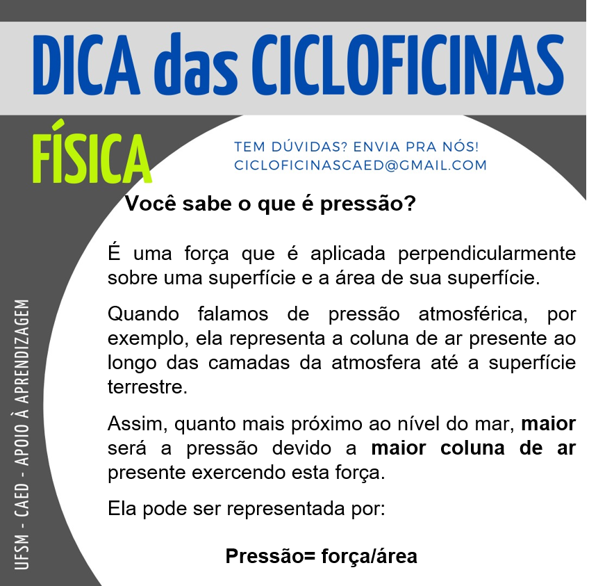 Descrição da imagem: Imagem retangular na horizontal, o fundo é na cor cinza escuro. Na parte superior há um retângulo na cor cinza claro onde tem escrito em letras na cor azul o título “Dicas das Cicloficinas”. Abaixo e no lado esquerdo, em letras na cor verde “Física” e do lado em letras pequenas e na cor azul “Tem dúvidas? Envia pra nós! cicloficinascaed@gmail.com”. No centro da imagem há um círculo na cor branca e dentro dele, em letras na cor preta há a seguinte dica: “Você sabe o que é pressão? É uma força que é aplicada perpendicularmente sobre uma superfície e a área de sua superfície. Quando falamos de pressão atmosférica, por exemplo, ela representa a coluna de ar presente ao longo das camadas da atmosfera até a superfície terrestre. Assim, quanto mais próximo ao nível do mar, maior será a pressão devido a maior coluna de ar presente exercendo esta força. Ela pode ser representada por: Pressão= força/área.” Na lateral esquerda da imagem, em letras na cor branca há “UFSM – CED – Apoio à aprendizagem”.