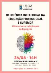 Descrição de imagem: Cartaz virtual para divulgação de evento. Na parte superior, centralizado, o brasão da UFSM, à direita “UFSM” e abaixo, em letras menores, “Coordenadoria de Ações Educacionais”. Logo abaixo, centralizado, em caixa alta e em preto “Deficiência Intelectual na Educação Profissional e Superior”. Abaixo, ainda centralizado “Alternativas e adaptações pedagógicas”, em rosa. No centro do cartaz, a ilustração de um cérebro humano. Na parte inferior, em letras maiores e cor rosa, “24/08 – 14h”. Na sequência, uma após a outra: “Educadoras Especiais” “Fabiane Vanessa Breitenbach” “Monique Zanon da Rosa”, em preto. Centralizado inferiormente, em letras maiúsculas, fonte menor e cor rosa “Inscrições via formulário”.