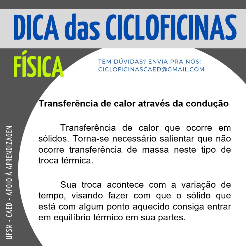 Descrição da imagem: Imagem retangular na horizontal, com fundo na cor cinza escuro. Na parte superior há um retângulo na cor cinza claro onde tem escrito em letras na cor azul o título “Dica das Cicloficinas”. Abaixo e no lado esquerdo, em letras na cor verde “Física” e do lado em letras pequenas e na cor azul “Tem dúvidas? Envia pra nós! cicloficinascaed@gmail.com”. No centro da imagem há um círculo na cor branca e dentro dele, em letras na cor preta há a seguinte dica: “Transferência de calor através da condução” abaixo, “Transferência de calor que ocorre em sólidos. Torna-se necessário salientar que não ocorre transferência de massa neste tipo de troca térmica. Sua troca acontece com a variação de tempo, visando fazer com que o sólido que está com algum ponto aquecido consiga entrar em equilíbrio térmico em suas partes”. Na lateral esquerda da imagem, na vertical, em letras na cor branca há “UFSM – CAED – Apoio à Aprendizagem”.
