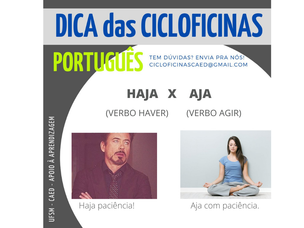 A equipe do Projeto Cicloficinas da Subdivisão de Apoio à Aprendizagem (CAEd-PROGRAD) traz uma dica de língua portuguesa para tirar qualquer dúvida sobre quando usar haja ou aja. Preste atenção!