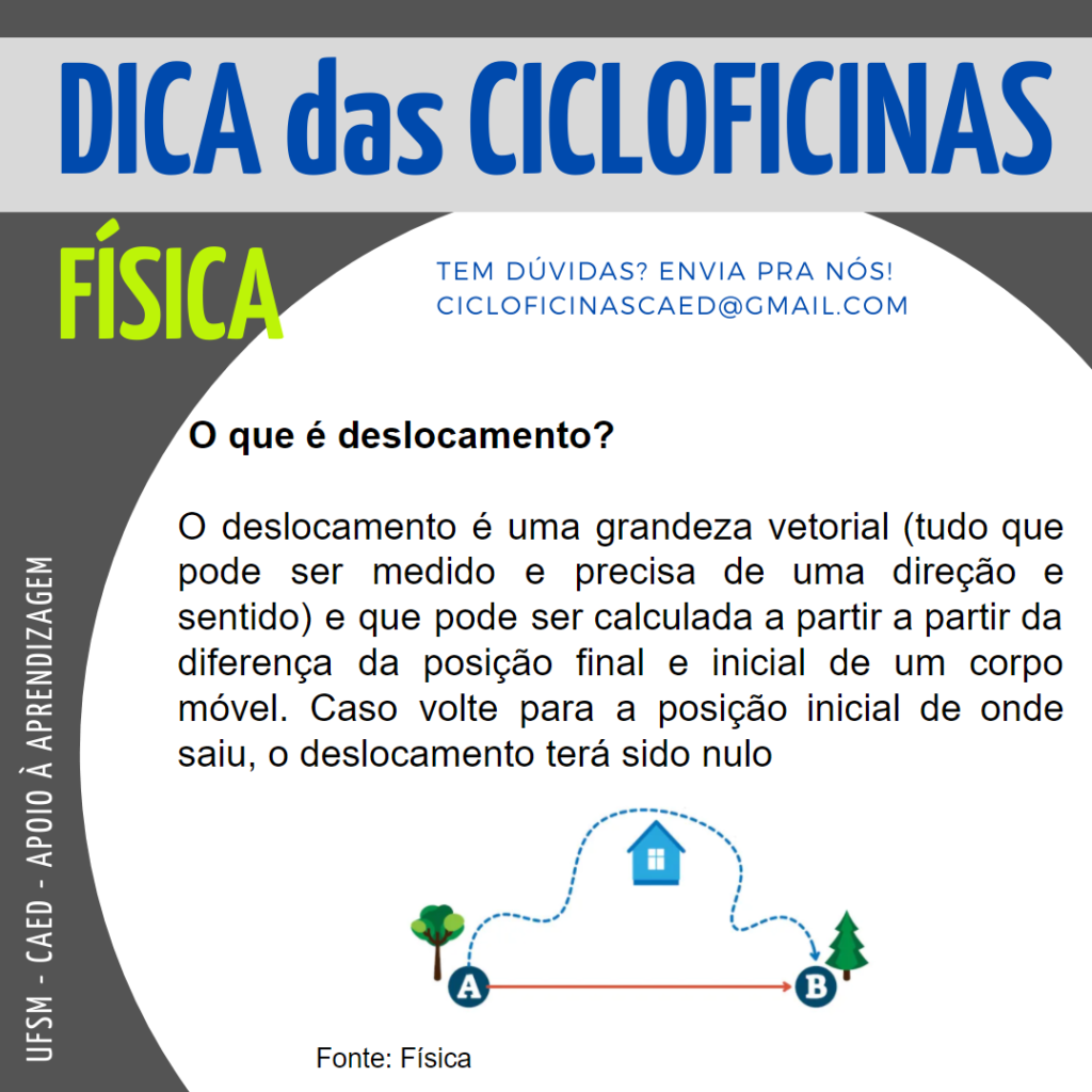 Descrição da imagem:  Imagem retangular na horizontal, o fundo é na cor cinza escuro. Na parte superior há um retângulo na cor cinza claro onde tem escrito em letras na cor azul o título “Dica das Cicloficinas”. Abaixo e no lado esquerdo, em letras na cor verde “Física” e do lado em letras pequenas e na cor azul “Tem dúvidas? Envia pra nós! cicloficinascaed@gmail.com”. No centro da imagem há um círculo na cor branca e dentro dele, em letras na cor preta há a seguinte dica: “O que é deslocamento” abaixo, “O descolamento é uma grandeza vetorial (tudo que pode ser medido e precisa de uma direção e sentido) e que pode ser calculada a partir da diferença da posição final e inicial de um corpo móvel. Caso volte para a posição inicial de onde saiu, o deslocamento terá sido nulo”. Na parte inferior da imagem, encontra-se uma ilustração de um ponto A onde tem um desenho de uma árvore, seguindo a rota de linhas na cor azul, no meio, um desenho de uma casa na cor azul e as linhas indo até o ponto B, onde tem um desenho de um pinheiro. Na lateral esquerda inferior da imagem, na vertical, em letras na cor branca há “UFSM – CAED – Apoio à aprendizagem”.