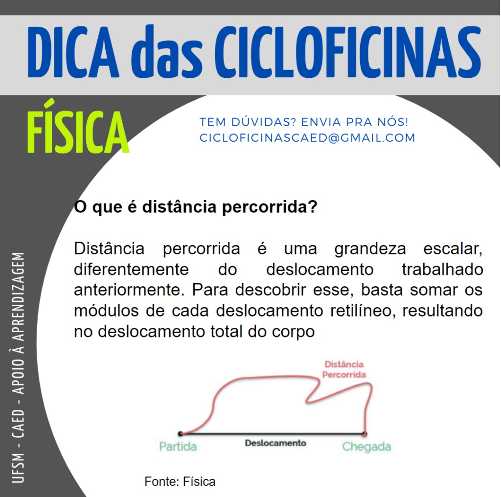 Descrição da Imagem: Imagem retangular na horizontal, o fundo é na cor cinza escuro. Na parte superior há um retângulo na cor cinza claro onde tem escrito em letras na cor azul o título “Dica das Cicloficinas”. Abaixo e no lado esquerdo, em letras na cor verde “Física” e do lado em letras pequenas e na cor azul “Tem dúvidas? Envia pra nós! cicloficinascaed@gmail.com”. No centro da imagem há um círculo na cor branca e dentro dele, em letras na cor preta há a seguinte dica: “O que é distância percorrida?” abaixo, “Distância percorrida é uma grandeza escalar, diferentemente do deslocamento trabalhado anteriormente. Para descobrir esse, basta somar os módulos de cada deslocamento retilíneo, resultando no deslocamento total do corpo”. Na parte inferior da imagem, encontra-se uma ilustração de uma linha reta na cor preta, no início da linha tem um ponto e está escrito “Partida”, no meio está escrito “deslocamento” e no final “chegada”. Acima desta linha preta, encontra-se uma linha vermelha partindo do ponto de partida com algumas ondulações acima e para baixo, onde está escrito “Distância Percorrida”, chegando até o ponto de chegada. Na lateral esquerda inferior da imagem, na vertical, em letras na cor branca há “UFSM – CAED – Apoio à aprendizagem”.